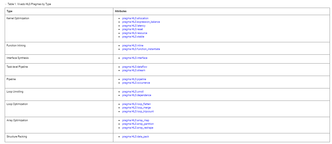 - HLS tool also provides pragmas that can be used to optimize the design: reduce latency, improve throughput performance, and reduce area and device resource usage of the resulting RTL code.